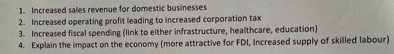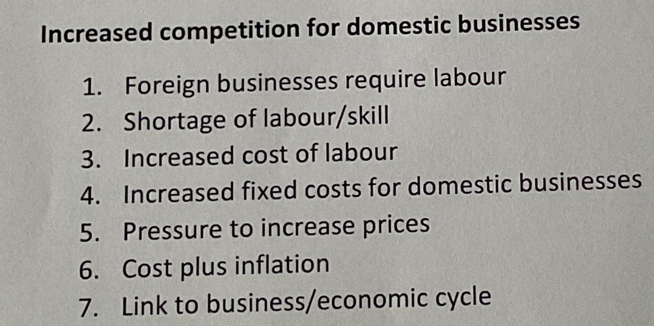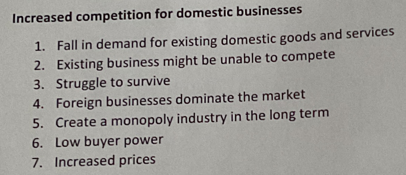 Give some example analysis points for increased competition for domestic businesses that links to the business cycle (7)