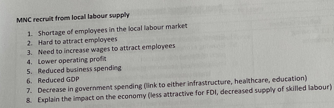 Give some example analysis points for MNC recruit from local labour supply (8)