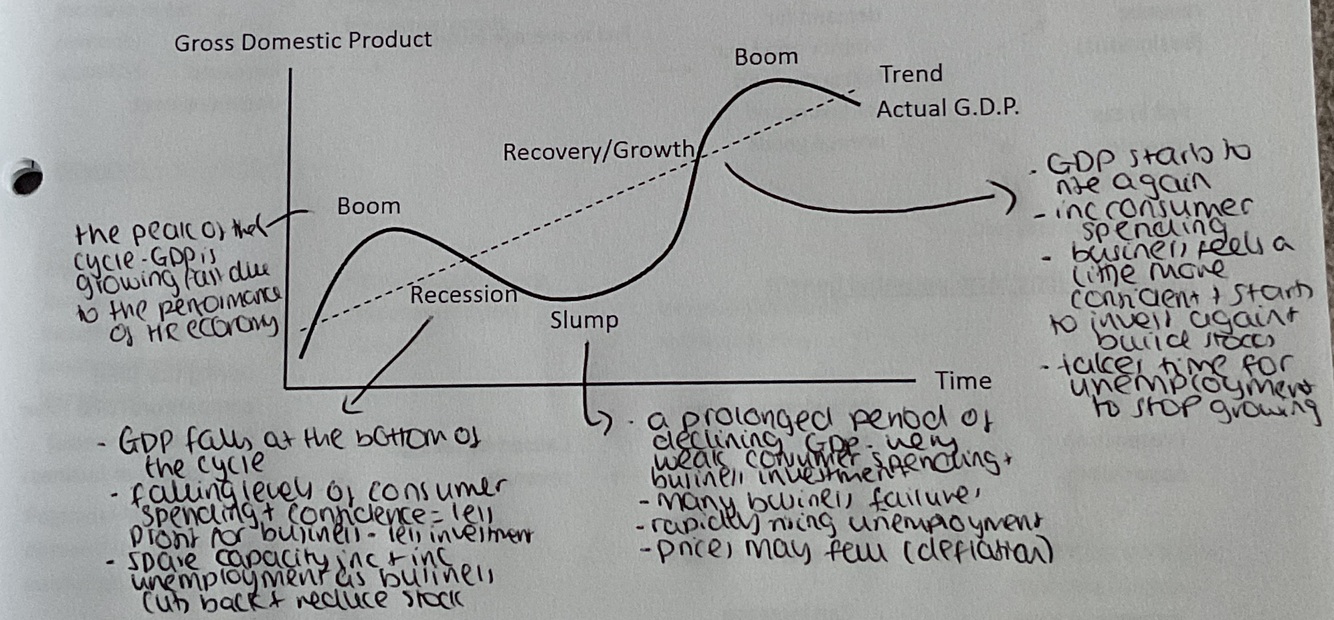 The business cycle illustrates the changes that occur in economic activity measured by GDP. Each change has a name e.g. boom, recession, slump, recovery. The economy will naturally go through each of the stages over time .