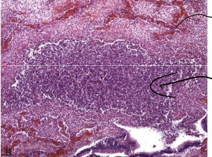 milieu= inflammation suppurative ou purulente ( on voit un exsudat avec bcppp trop de neutrophiles= abcès)