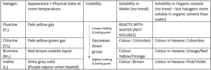 (h) a description of the following physical properties of the halogens: appearance and physical state at room temperature, volatility, solubility in water and organic solvents