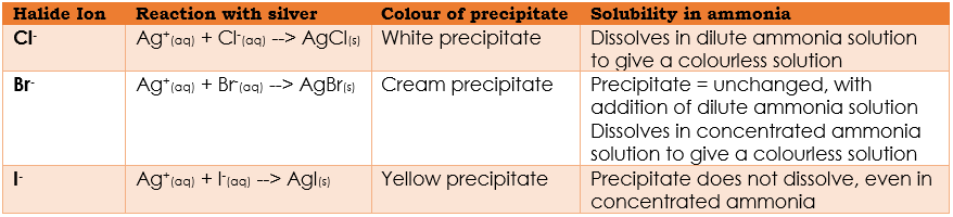 (k) the reactions between halide ions (Cl–, Br– and I–) and silver ions (Ag+) and ionic equations to represent these precipitation reactions, the colours of the precipitates and the solubility of silver halides in ammonia