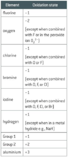 (e) the oxidation states assigned to and calculated for specified atoms in formulae (including ions) and explanation of which species have been oxidised and which reduced in a redox reaction