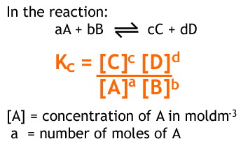 (p) the equilibrium constant, Kc for a given homogeneous reaction; calculations of the magnitude of Kc and equilibrium concentrations using data provided; relation of position of equilibrium to size of Kc, using symbols such as >,<,>>,<<