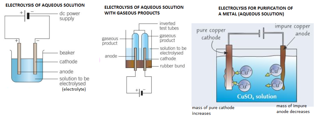(c) (ii) techniques and procedures in the electrolysis of aqueous solutions; half-equations for the processes occurring at electrodes in electrolysis of molten salts and aqueous solutions:
