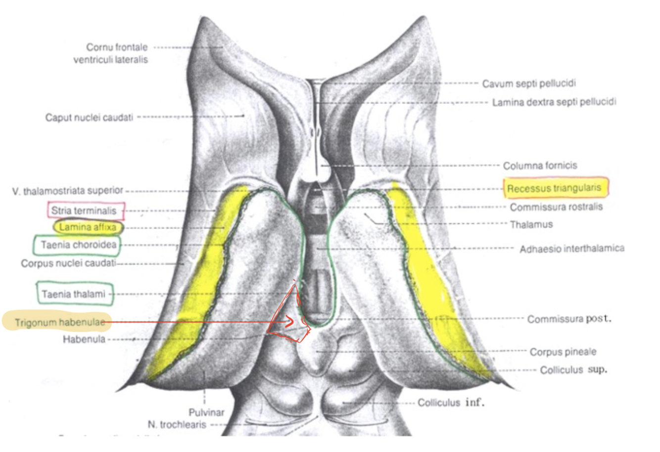 i. Medially: tenia thalami + habenular commissure