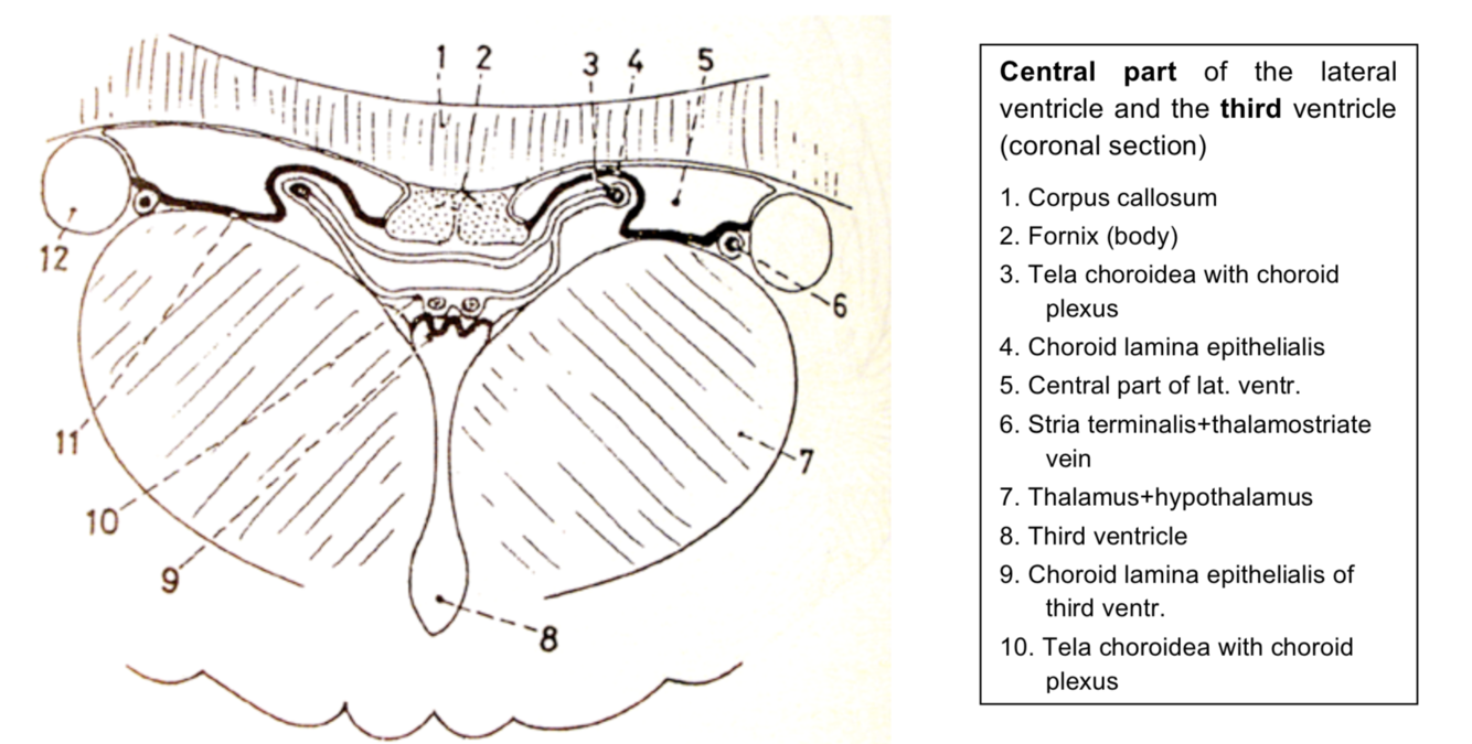 • Medial wall: choroid lamina epithelialis of the lateral ventricle, attached to the fornix (tenia fornicis) and to the thalamus (tenia choroidea). On the outer aspect of choroid lamina epithelialis the pia mater (together = choroid tela) and the choroid plexus can be found.