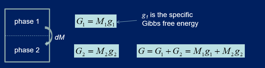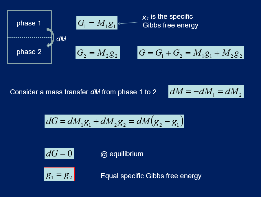 For a phase change in equilibrium, what is the relation between the specific gibbs energy between two phases 1 and 2? Hint: dG = 0, considet a small mass dM transferred from phase 1 to 2.