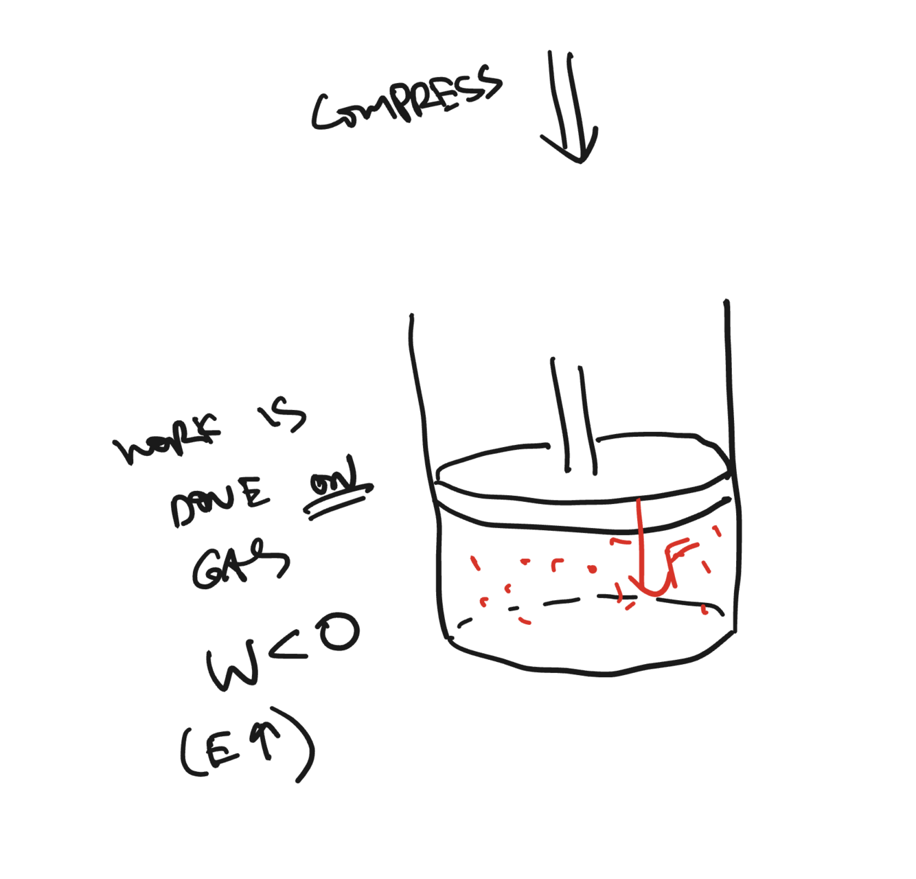 Now I am pushing on the thing and using my energy from outside to push on the gas, so the gas’s energy should go up! I am giving energy to the gas by compressing it so here work is being done ON the gas! So work here should be negative, so internal energy would be going up becuase energy from outside force, gas is exerting the force up but here the surroundings are exerting the force down* ENERGY GOES UP