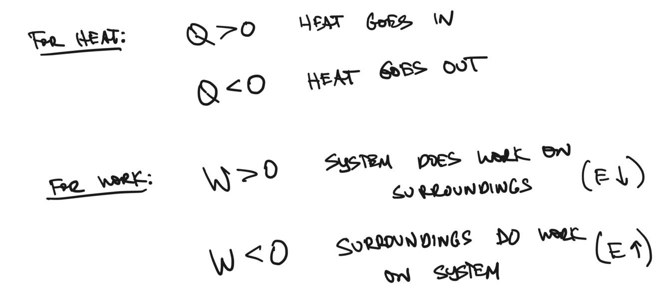 w>0 if I am doign something or puttin gin effort, means work is positive system is trying to do something but the internal energy of the system should go down, work is positive when the system does work on the surroundings* so when system does work on surroundings system is posistive, using energy to push what is around it, means its internal energy that goes down makes sense, minus a positive becomes negative; ENERGY GOES DOWN