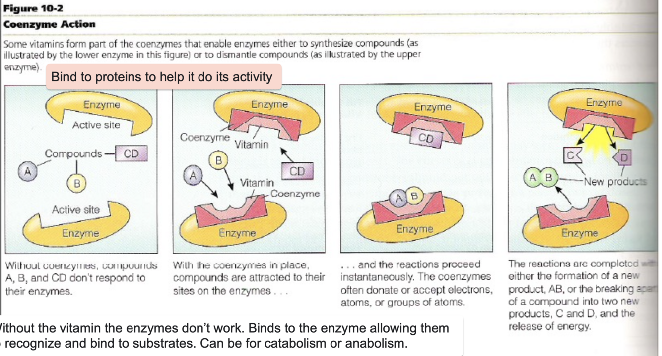 Bind to enzymes which enable them to perform activity to either synthesize compounds or dismantle them. Without coenzymes the substrate do not respond, so the vitamin creates an attractive force so that the enzyme recognizes the substrates