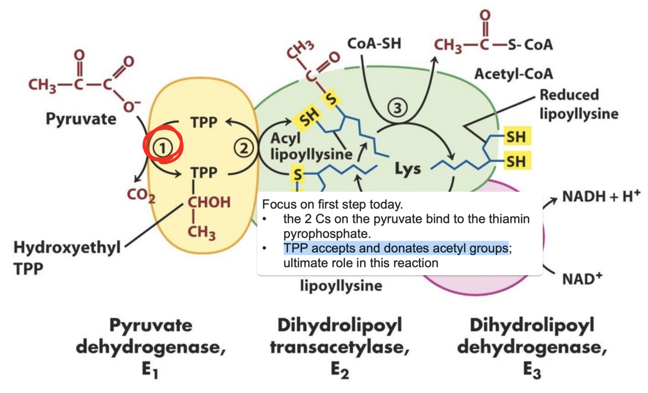 Involved in the first E1 with pyruvate dehydrogenase where TPP accepts and donates acetyl groups from pyruvate and CO2 is released.
