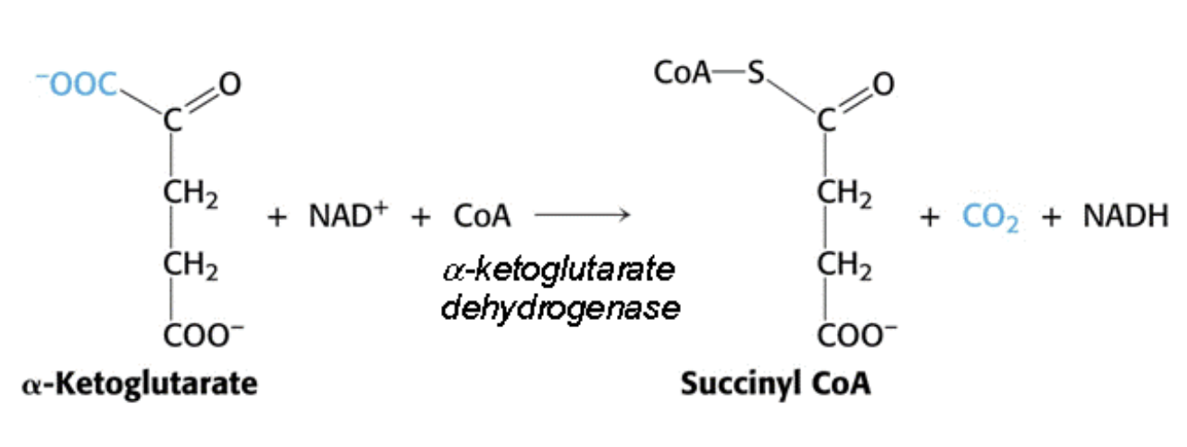 Part of the CAC, converting α-ketoglutarate → Succinyl CoA; NAD→NADH, releases CO2