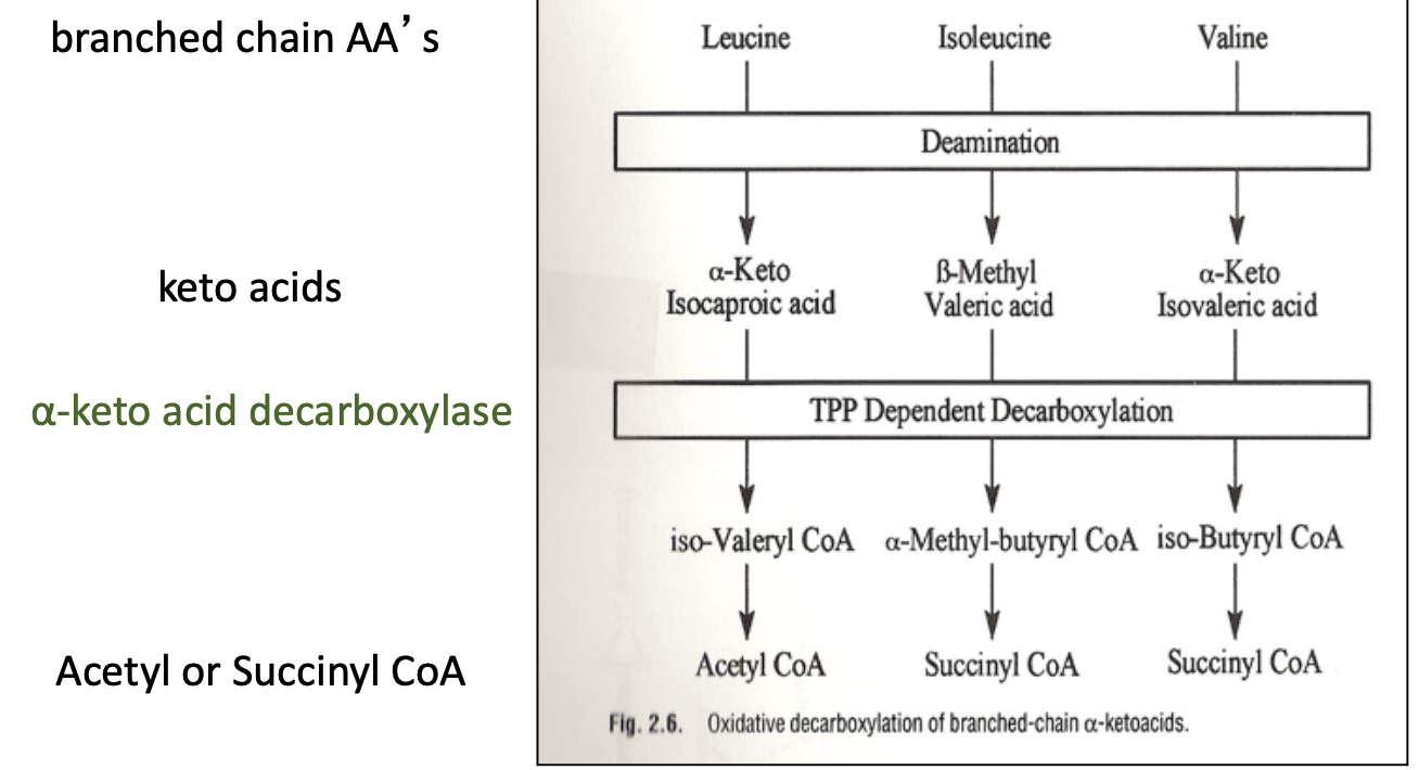 Required in the α-keto acid decarboxylation and without it there would be a build up of branched chain AAs and could not produce energy