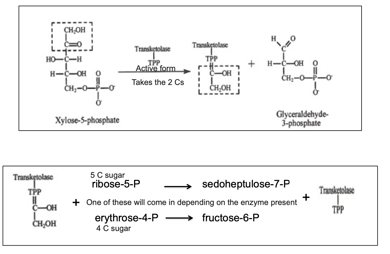* TPP is attached to transketolase and a 2 carbon structure from the sugar attaches to the TPP and depending on enzyme present the 2-C structure will transfer to a sugar and make a new one by adding on two Carbons