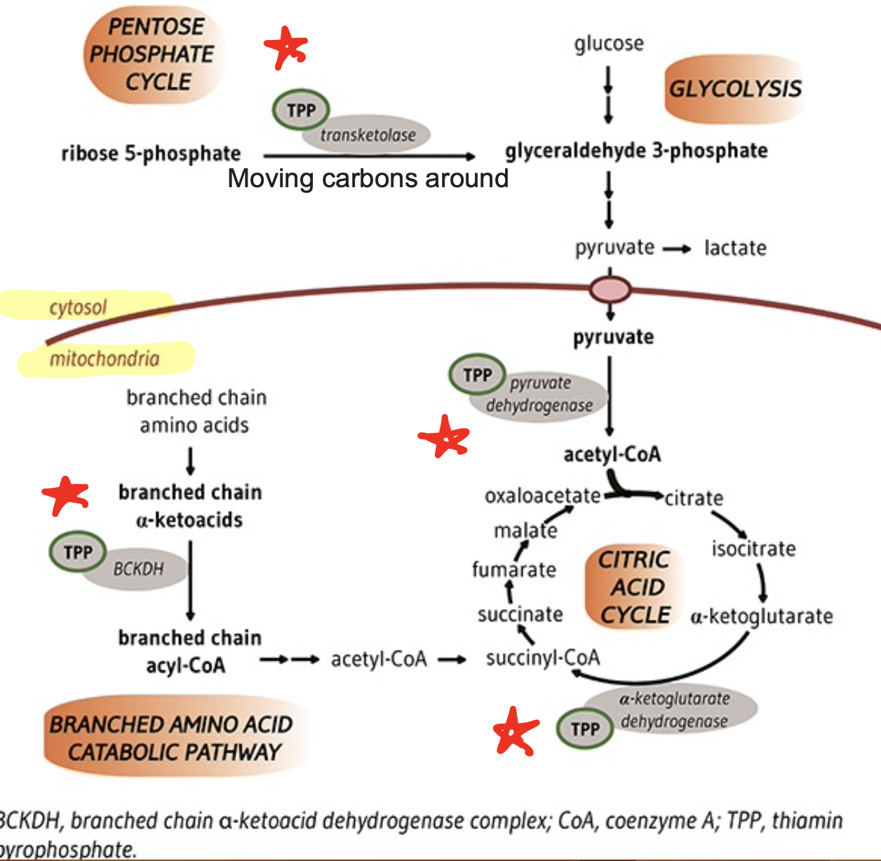Location of PDH, KDH, BCKDH, and transketolase