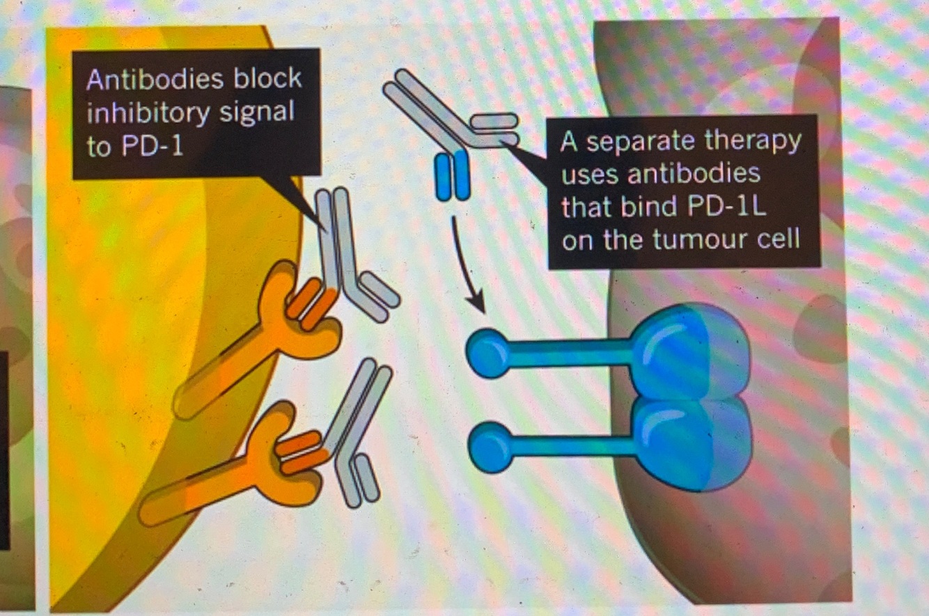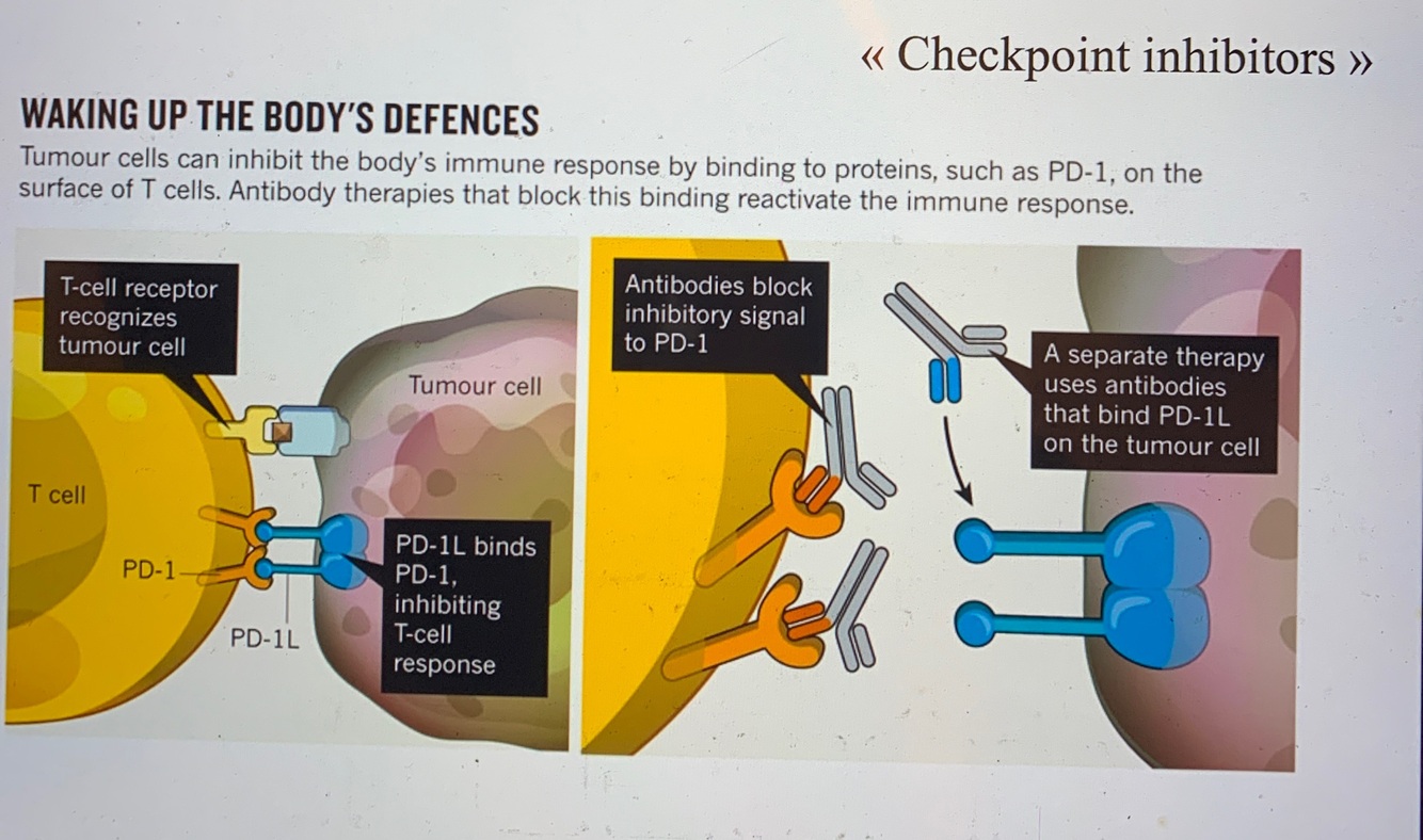 —> bloquent le signal inhibiteur de la lésion avec leur ligand exprime sur les c tumorales
