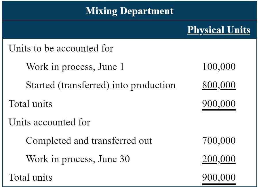 Physical units are the actual units to be accounted for during a period, regardless of any work performed. To keep track of these units, it is necessary to add the units started (or transferred) into production during the period to the units in process at the beginning of the period. This amount is called the total units to be accounted for.