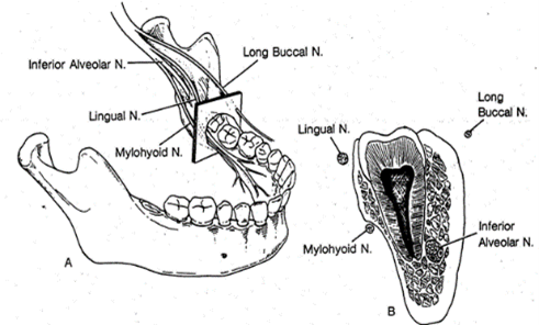 all mandibular teeth on that side and mucosa, skin of lower lip and chin on that side
