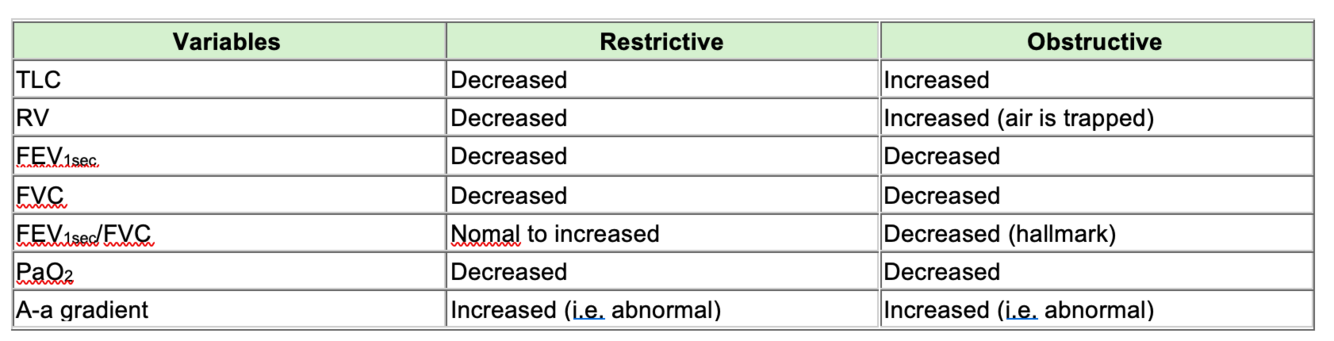 Restrictive lung disease decreases TLC, RV, FEV1, and FVC, with FEV1/FVC normal or increased.