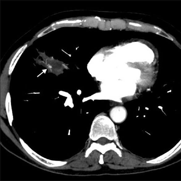 Angioinvasive aspergillosis. The ground-glass represents alveolar hemorrhage and the consolidation corresponds to a focus of infarction.