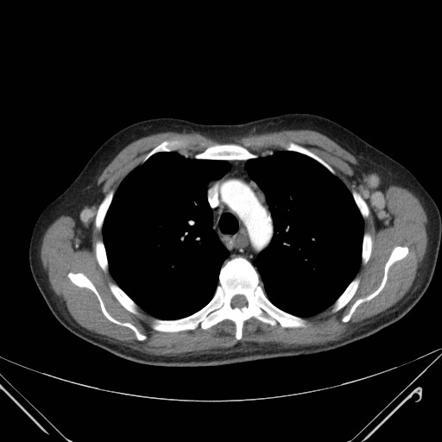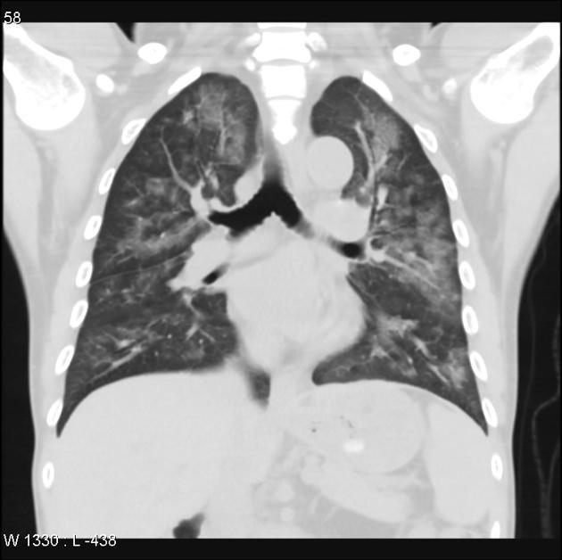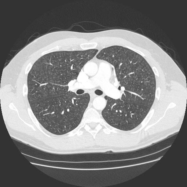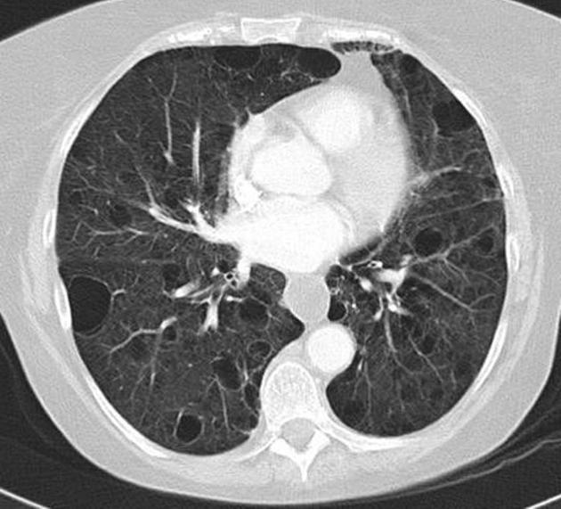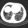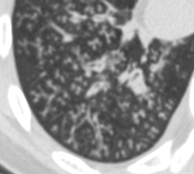 Imaging appearance: Ground-glass opacities in the parahilar regions and upper lobes. Severe cases may present with dense air-space consolidation. If there is interlobular septal thickening, can have crazy-paving pattern. May develop pulmonary cysts (risk of spontaneous pneumothorax). Chest x-ray can be normal. Pleural effusion and LAD uncommon.
