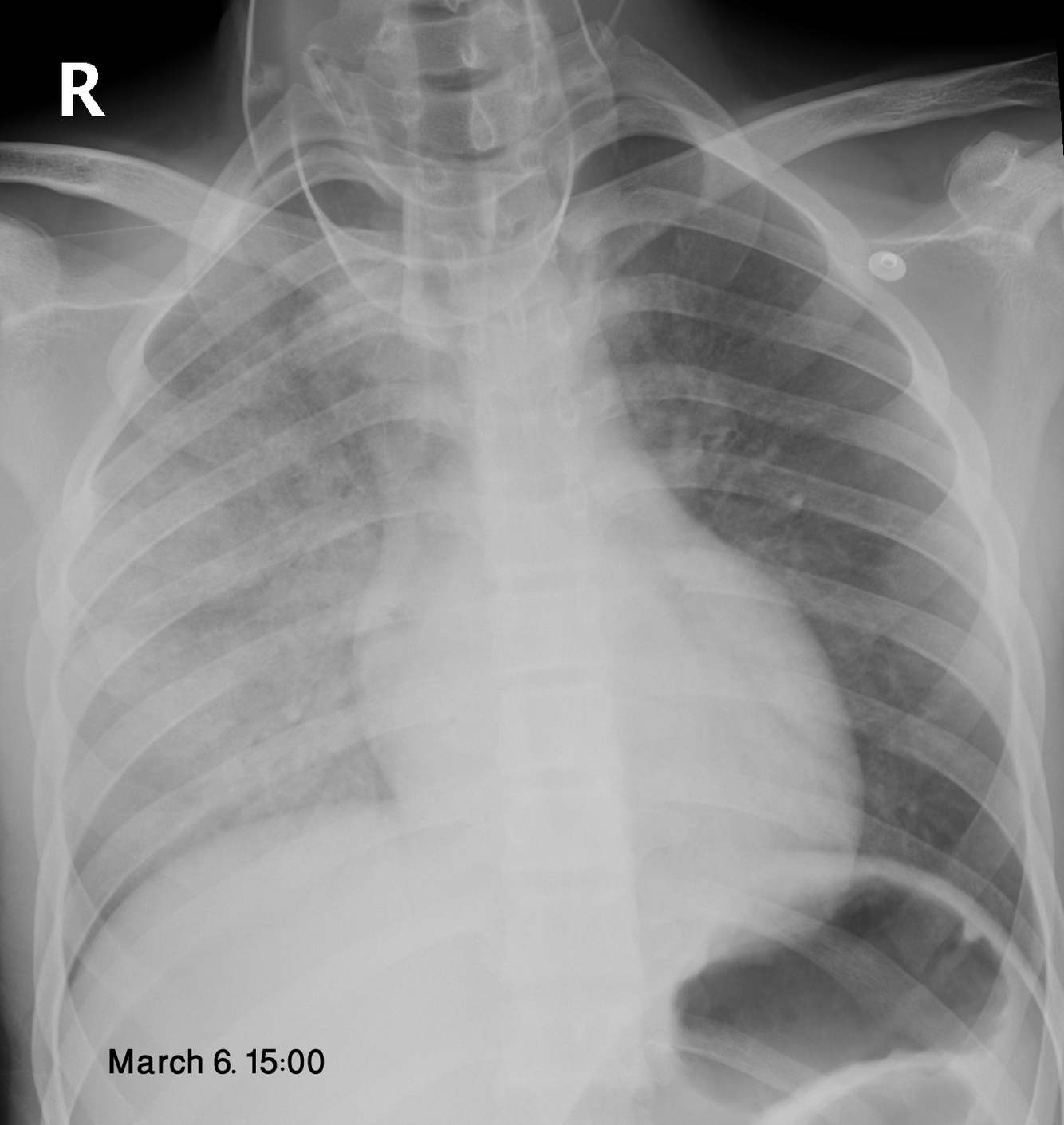 Heroin-induced pulmonary edema. A rare but serious complication of heroin overdose. Caused by increased capillary permeability, not heart failure. Can also see patchy atelectasis and nodular opacities.