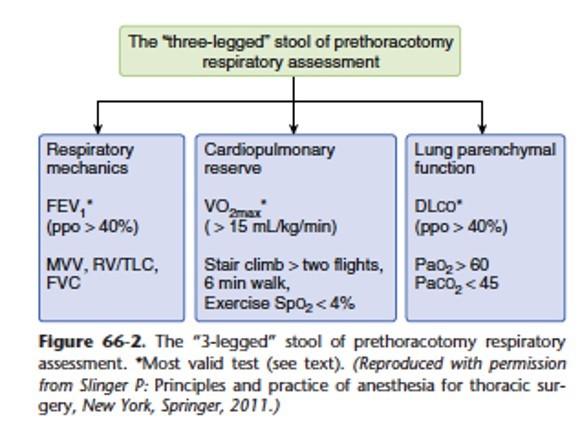 Wha is the three legged stool of pre-thoracotomy respiratory assessment? (chart)