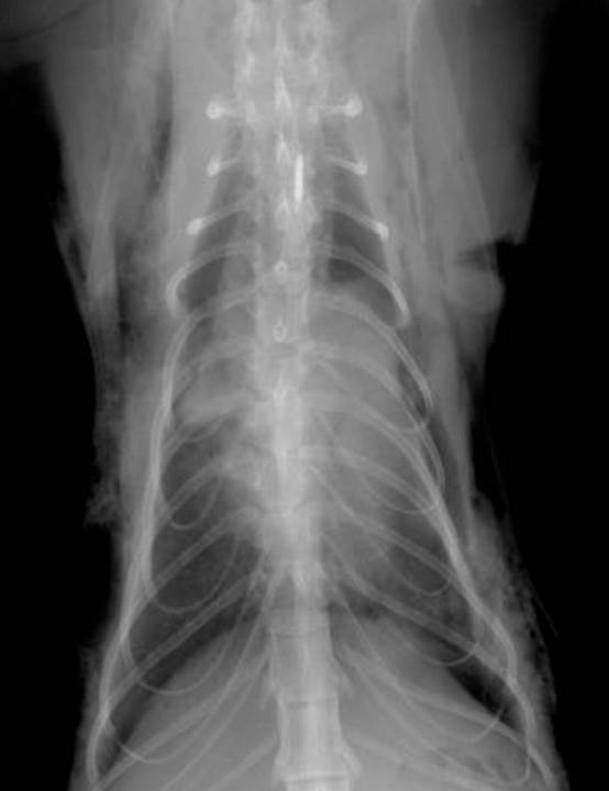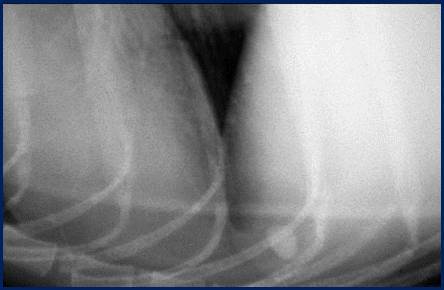 you see a number of changes – fluid in pleural cavity, separating lungs from thoracic wall, soft tissue fluid opacity – see it ventrally and dorsally. If lying on side, fluid drops to bottom and then spread up the sides slightly, separates lungs from spine and sternum – get rounding up, scalloping of lung edges ventrally, see bits of fluid going in between lung lobes. Also due to this fluid, get border obliteration of Cardiac Silhouette
