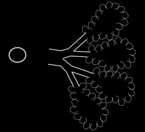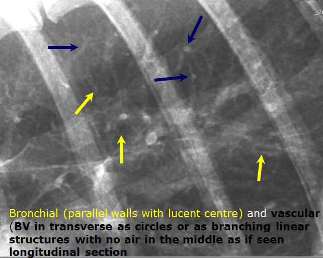 Bronchi can become thickened and will be seen further out towards the periphery, more so than usual – parallel lines called TRAM LINES and doughnuts.