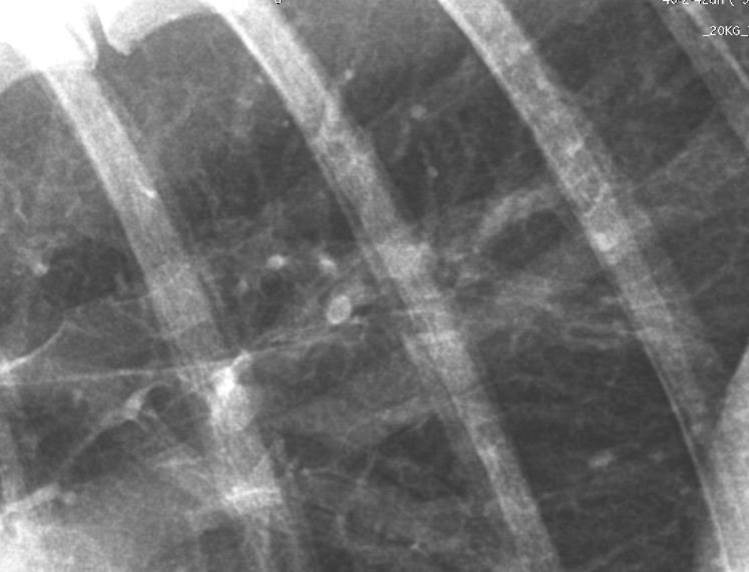 Can see increase opacity and cannot see cardiac silhouette – but can see air and lucencies in subcut tissues