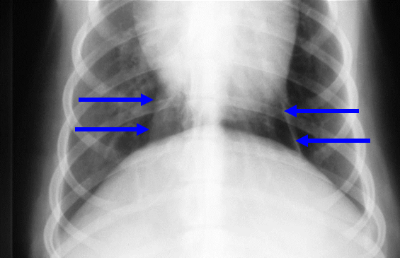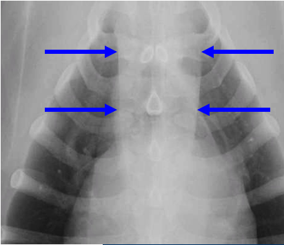 Blue arrows – can see margins between 2 lung lobes as there is a fold of mediastinum going in between the 2 lung lobes and if this margin is transverse whilst doing a lateral view, will see it