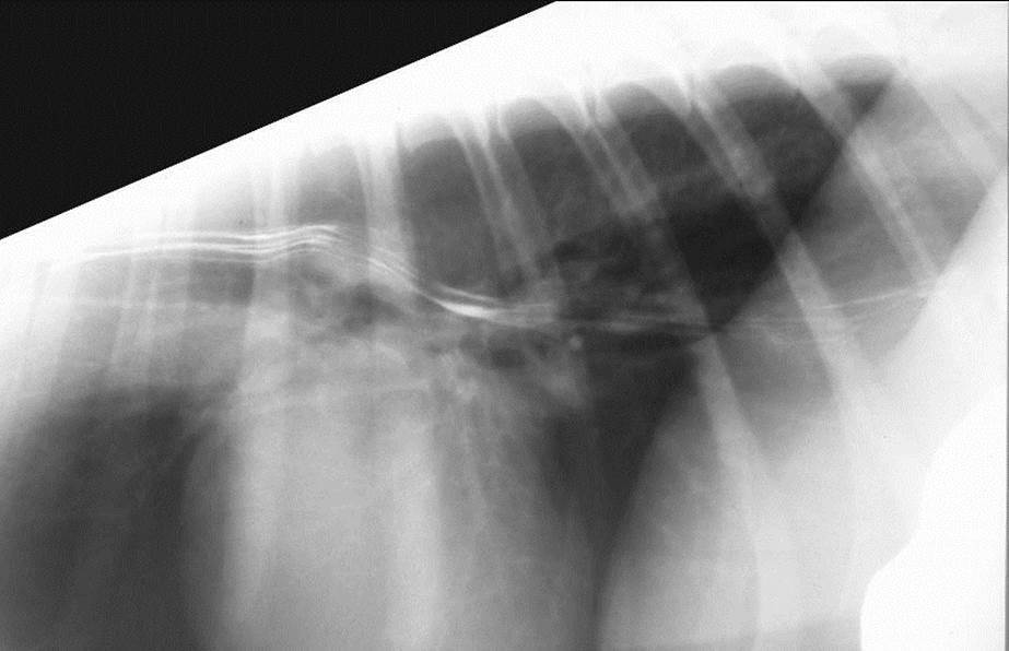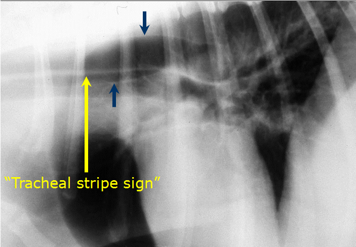There is a mass here – our mass effect can help – trachea is dorsally elevated and compressed, something solid doing this