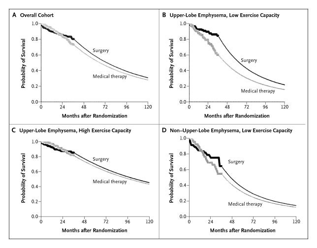 Patients whose emphysema was predominantly in the upper lobes and whose exercise capacity was low after pulmonary rehabilitation were more likely to function better two years after the surgery then those who received only medical therapy. These patients also appear to have a survival advantage with LVRS.