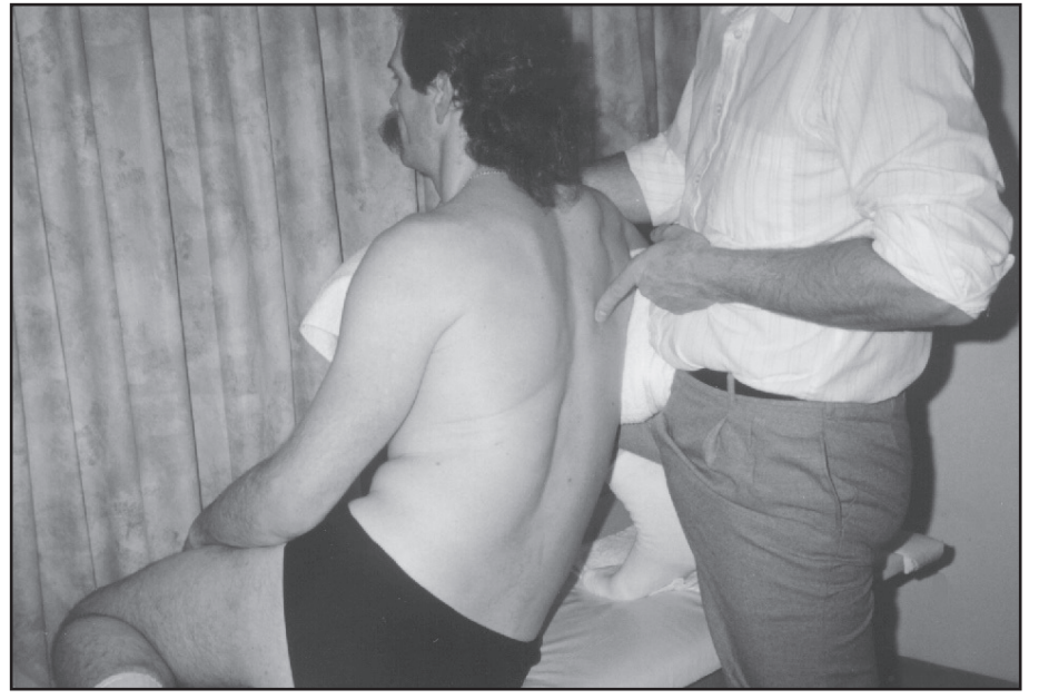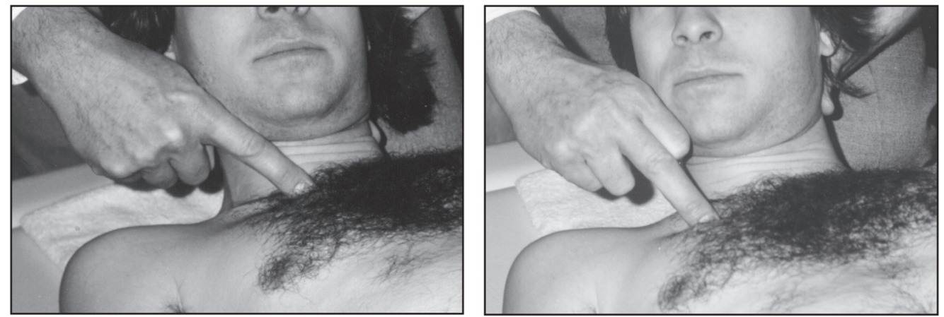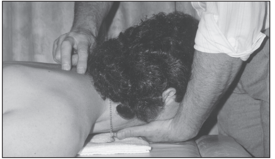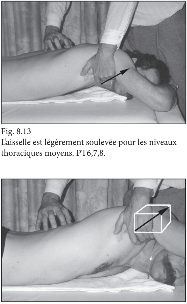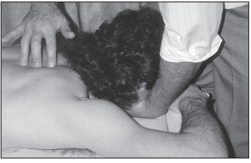 Lever menton légèrement pour amener une extension du T3 sur T4, et T4 sur T5. Ne pas basculer la tête postérieure sur la colonne