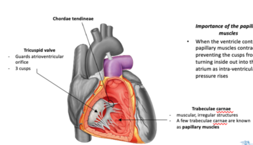 When the ventricle contracts, papillary muscles contract, preventing the cusps from turning inside out into the atrium as intra-ventricular pressure rises