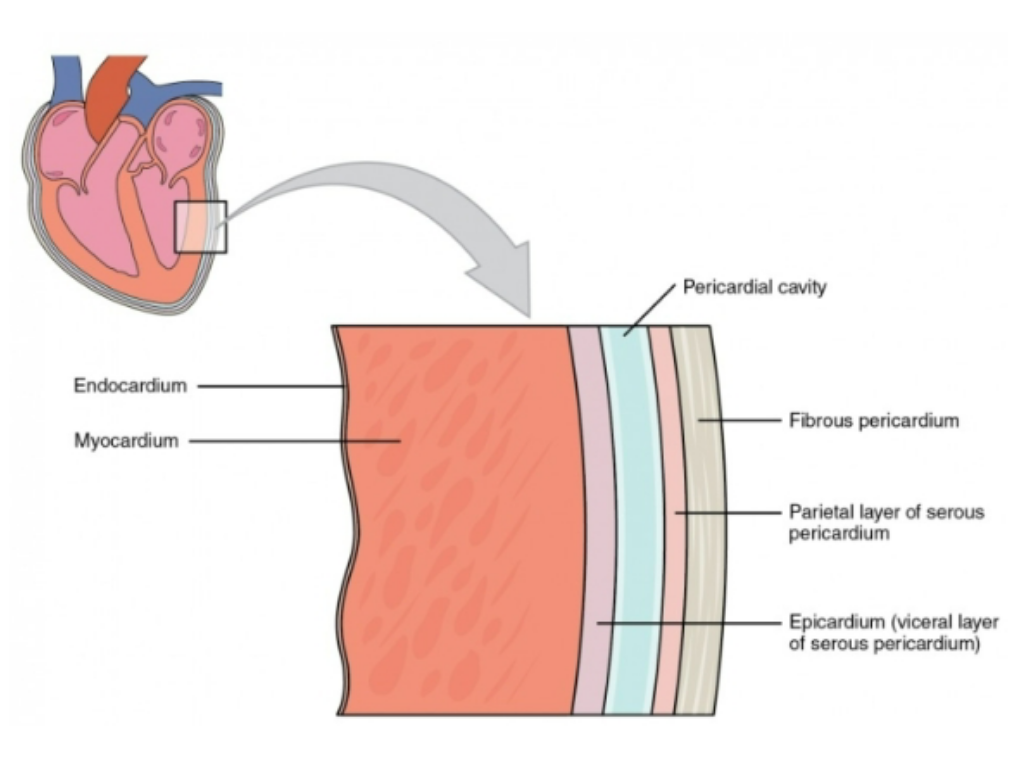 Epicardium: outermost layer of the heart, formed by the visceral layer of the serous pericardium. It is composed of connective tissue and fat
