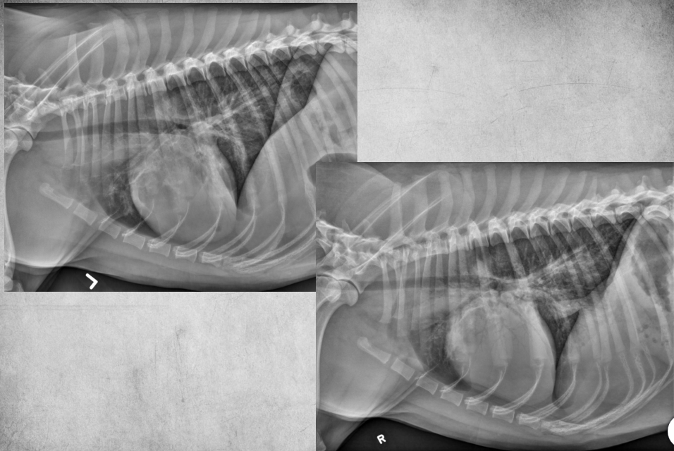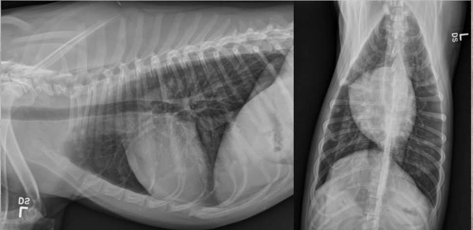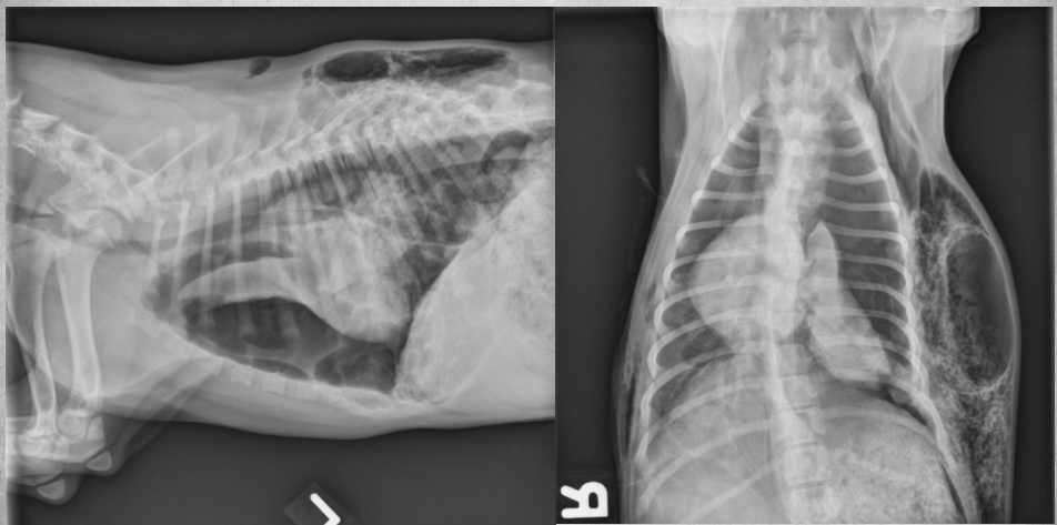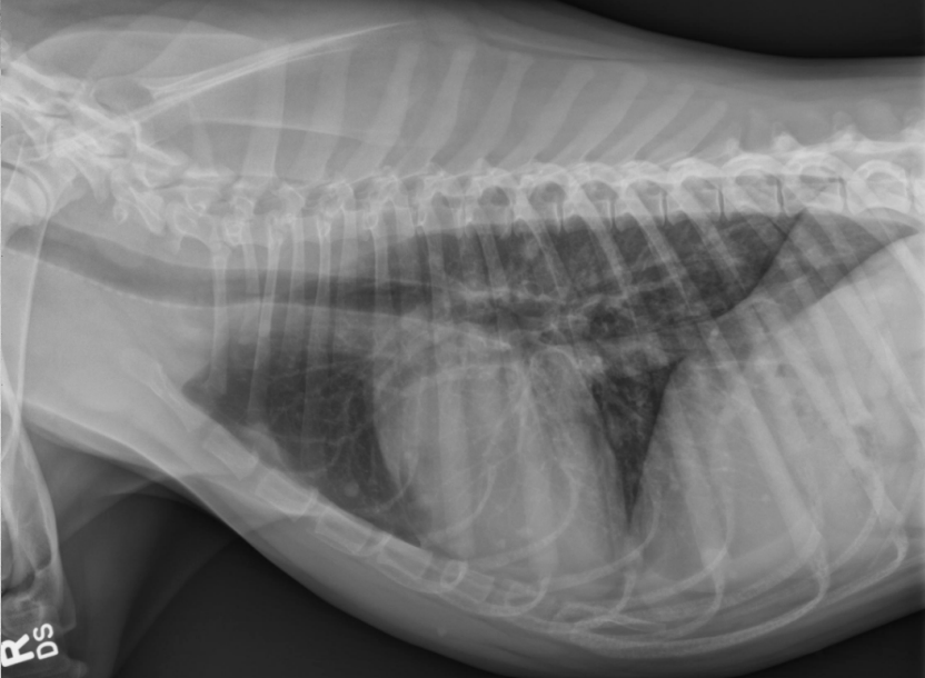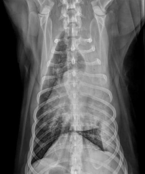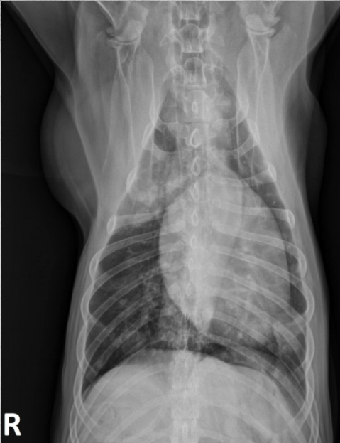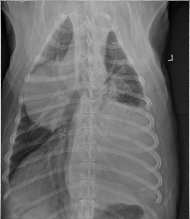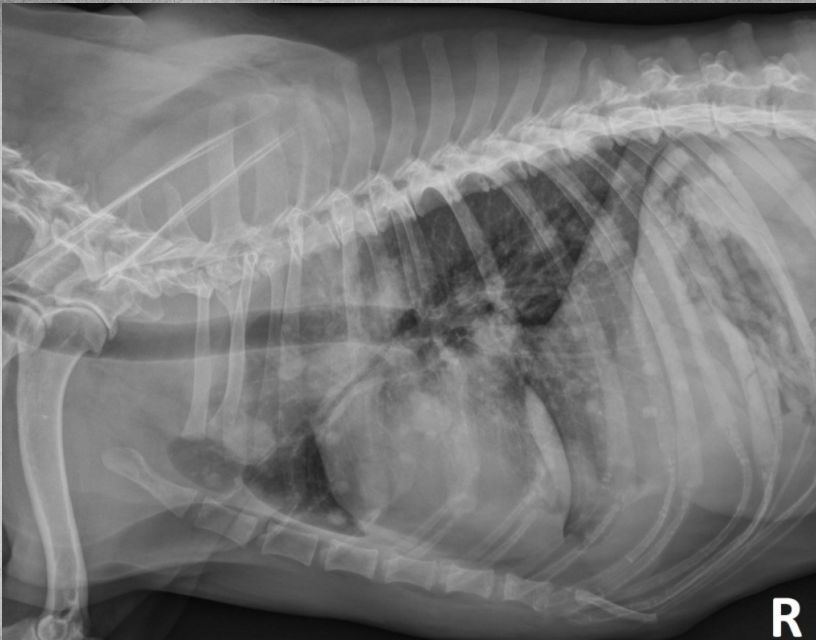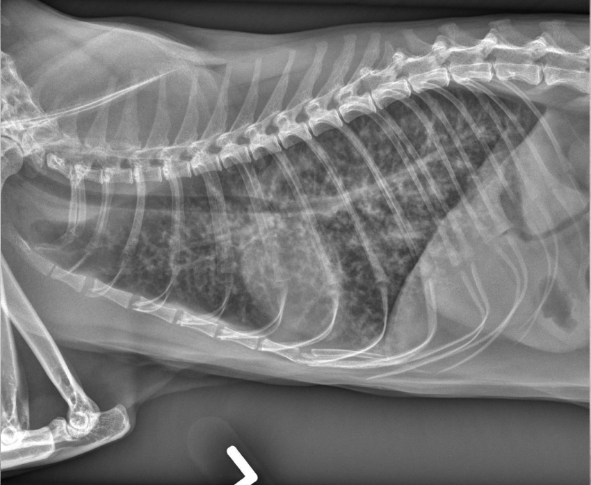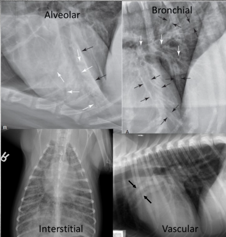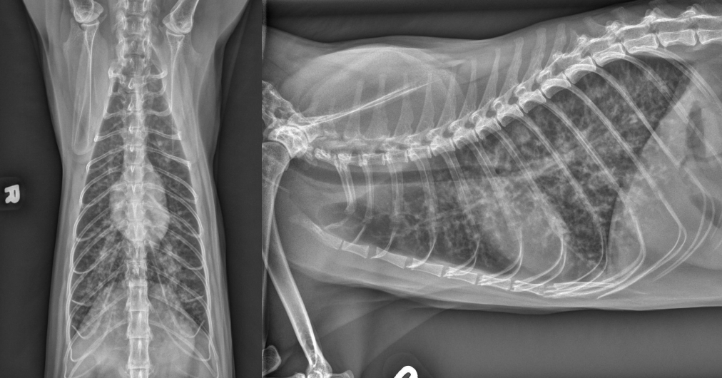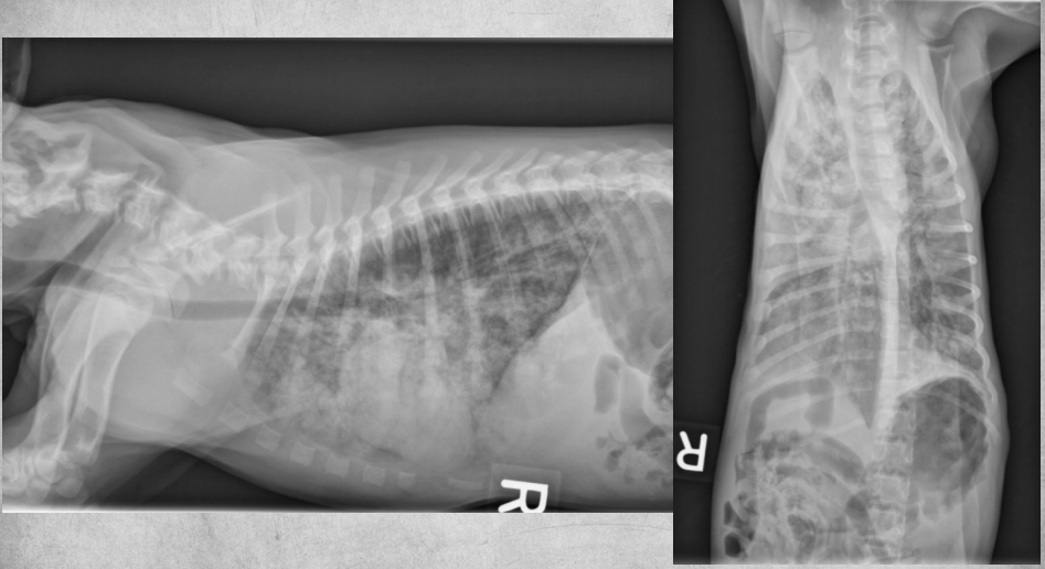 alveolar pattern, pulmonary edema (classic spot like in this pic: caudodorsal lung field)