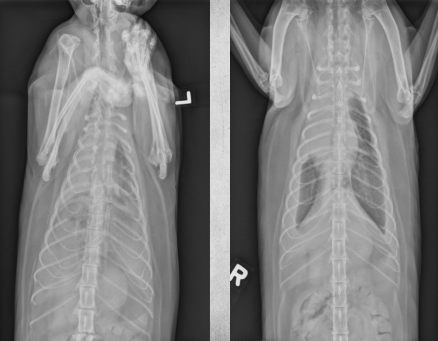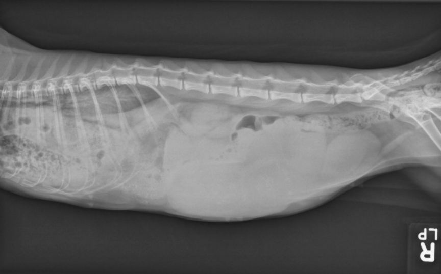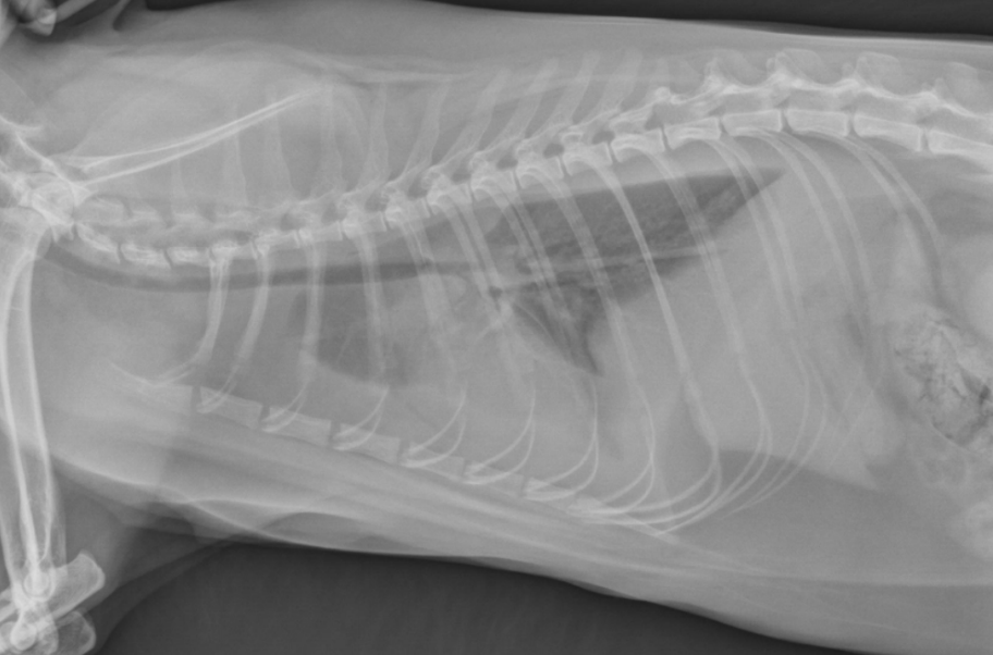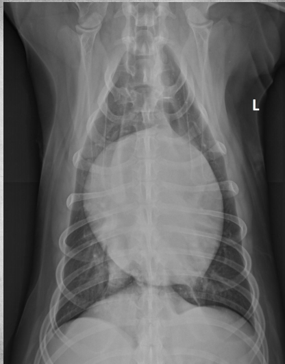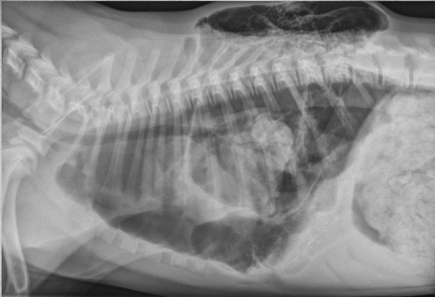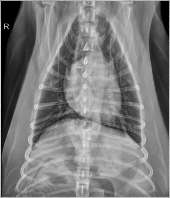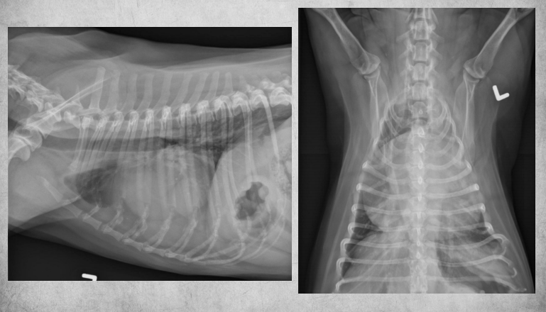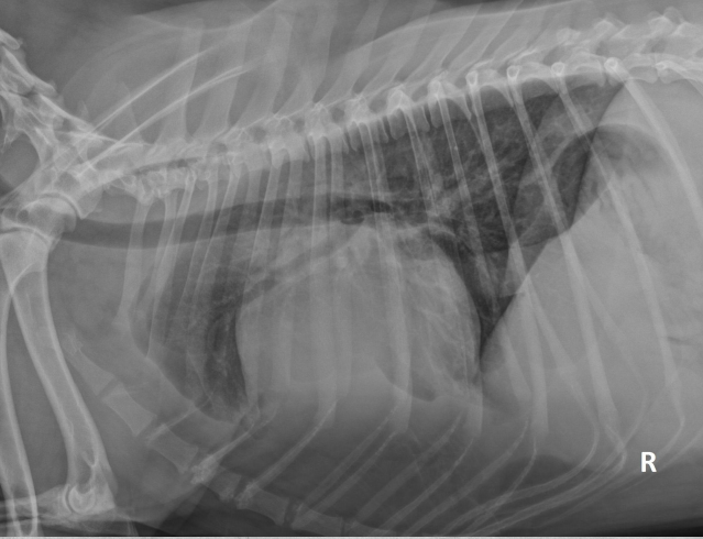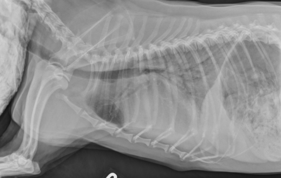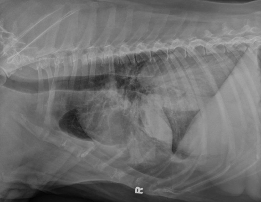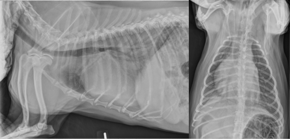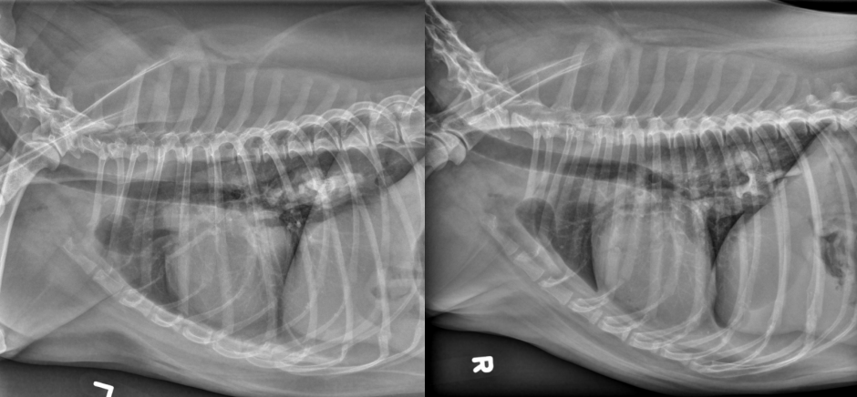 alveolar pattern, pulmonary edema (classic spot like in this pic: caudodorsal lung field)