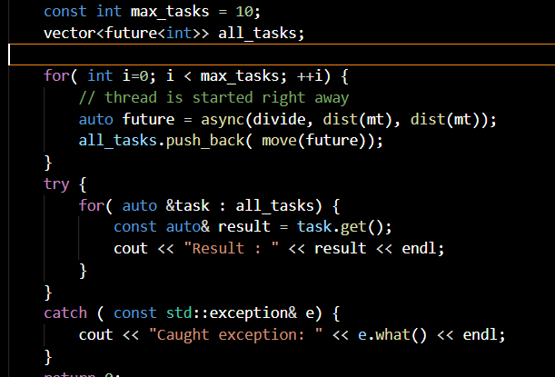 the following code will create 10 threads that execute “divide” function and return value will keep in “future” object that store in vector all_tasks.