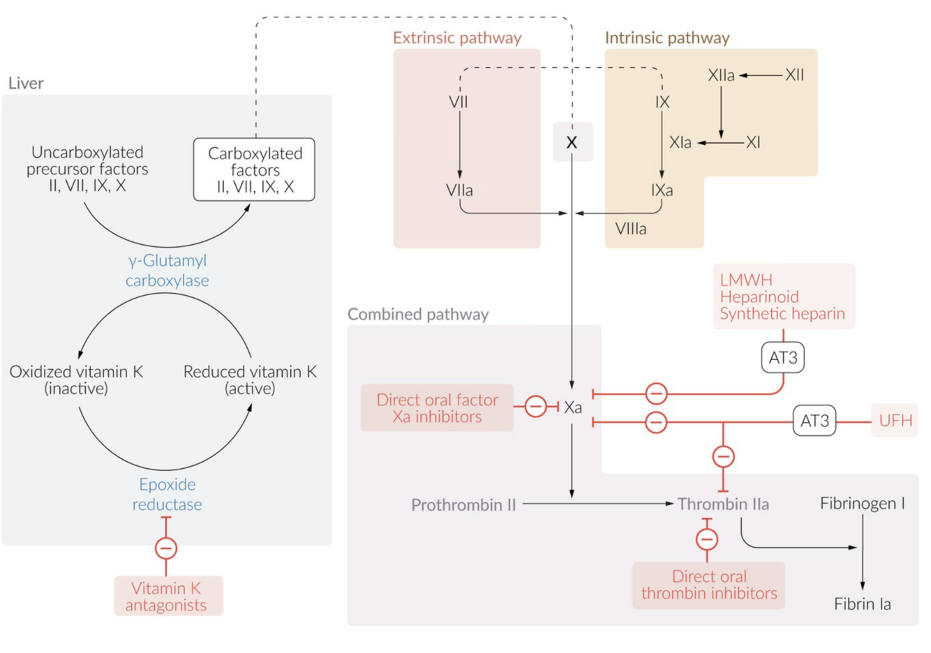 Heparin forms a complex with antithrombin and potentiates its effect –> inhibition of Factors II, X, IX and XI