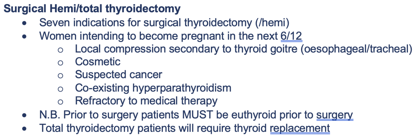 Main pre-op requirement and post-op treatment of surgical hemi/total thyroidectomy