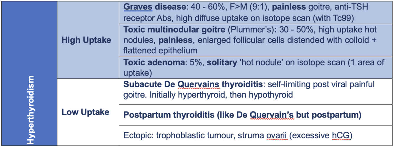 Graves, Toxic multinodular goitre, toxic adenoma, drugs, ectopic