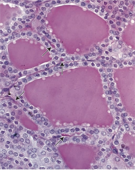 H&E of thyroid below shows pale staining area around the periphery of follicular space due to excess colloid use.