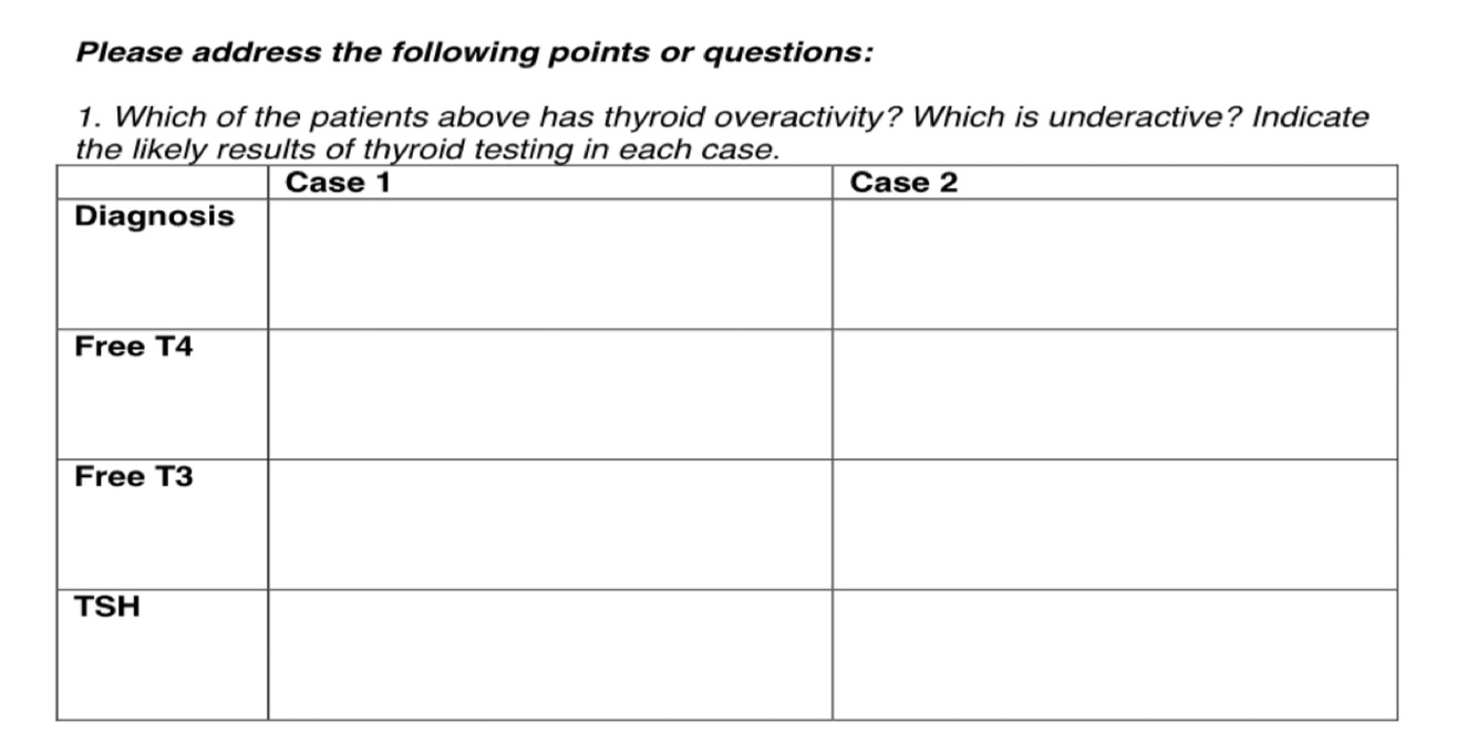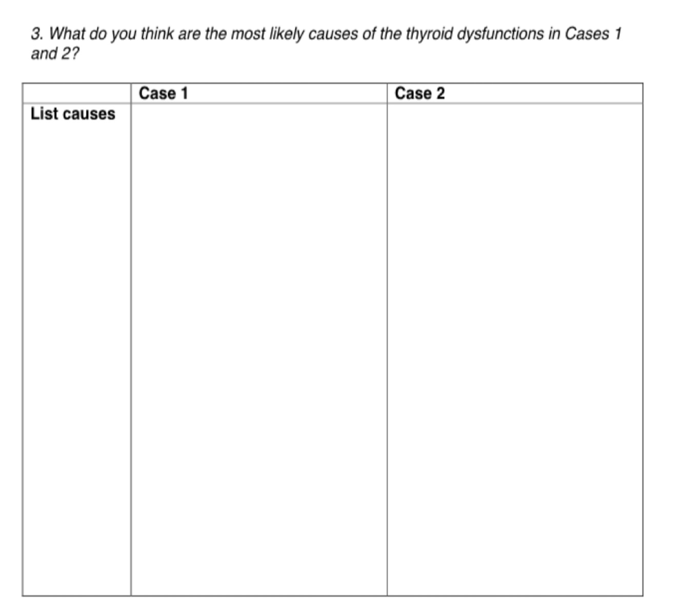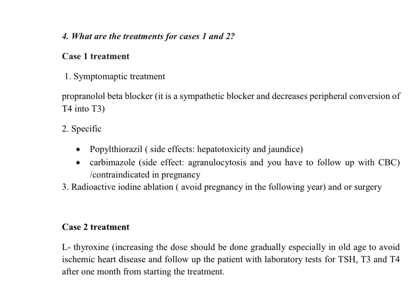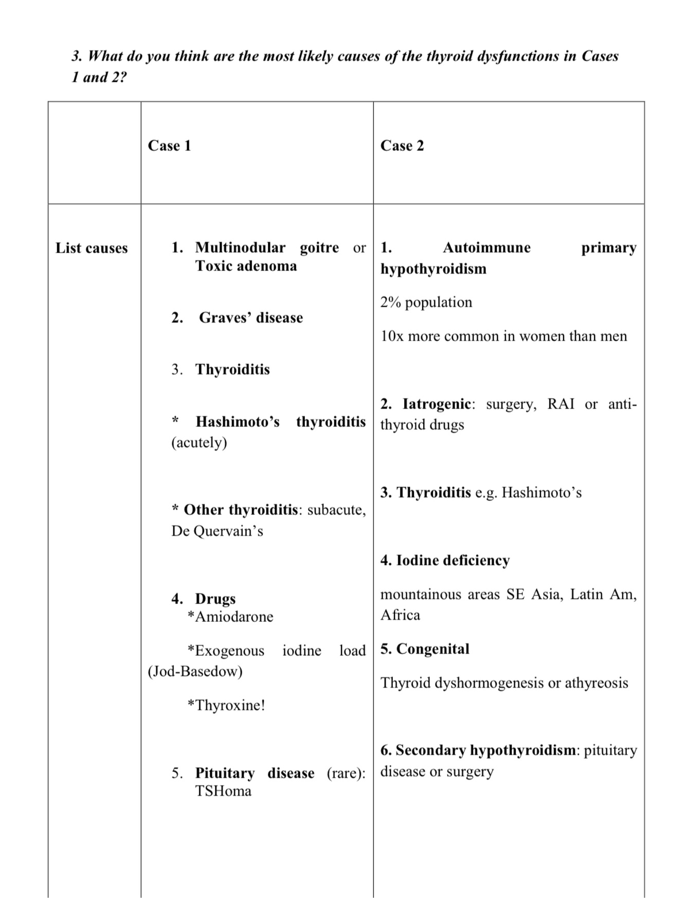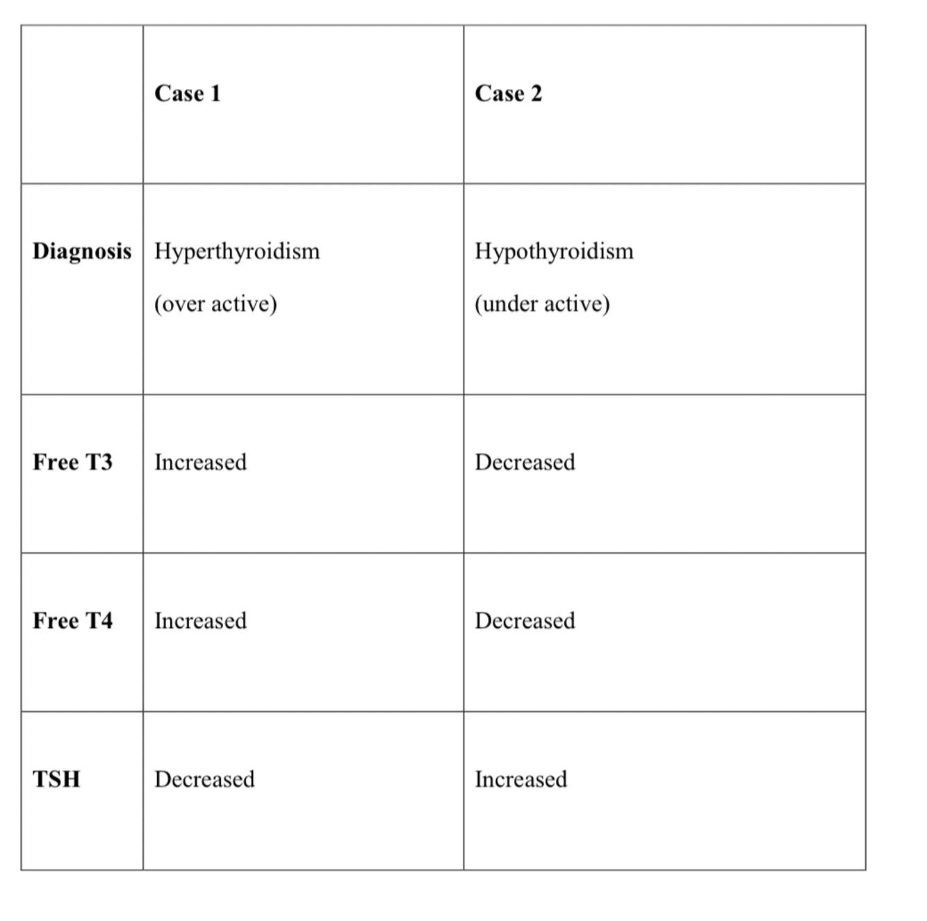 After therapy she became euthyroid and we seen at 6 monthily intervals at the latest visit she complained of lethargy, weight gain and feeling cold all the time. A blood test showed the following results: free T4 4.5pmol/L; TSH 25.7mU/L.