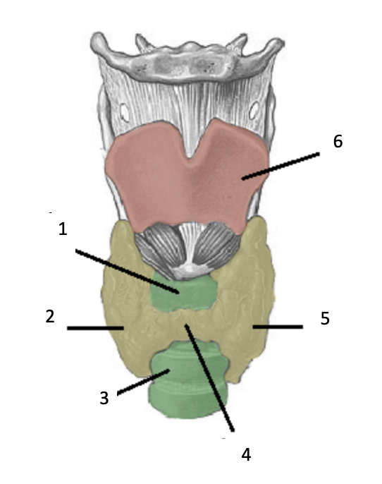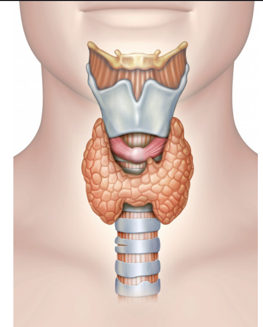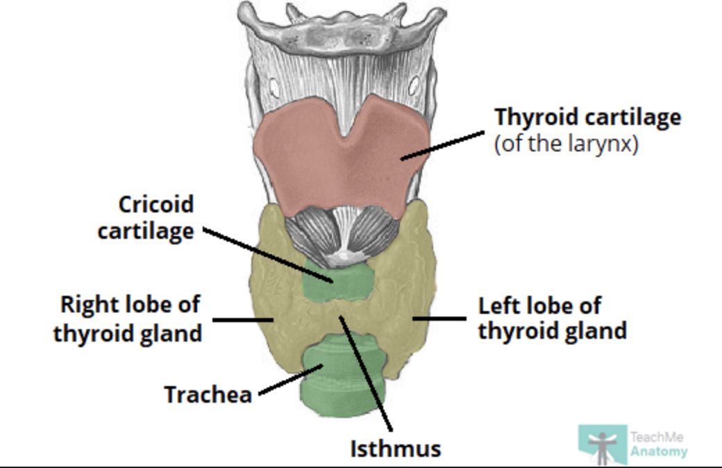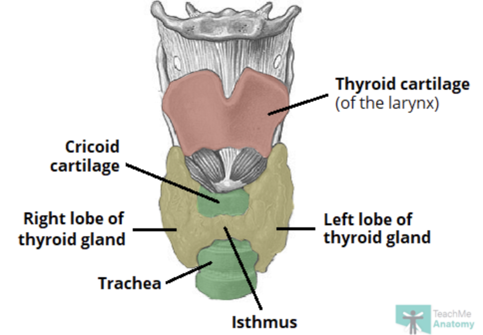 Which cartilage does the thyroid gland wrap around in the neck region?