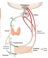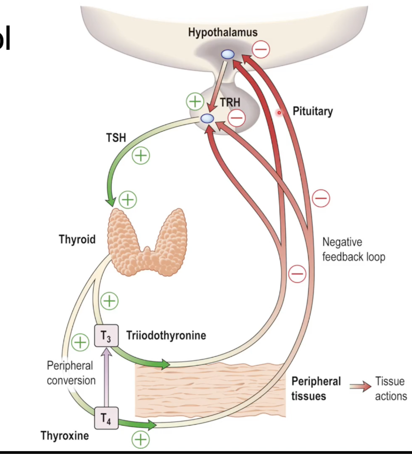 In order for thyroid hormones triodothyronine (T3) and thyroxine (T4) to have an affect at tissue throughout the body there are 3 stages of the positive feedback loop. These are essentially the stages that result in T3 and T4 being secreted and reaching the target tissue. What are the 3 stages?