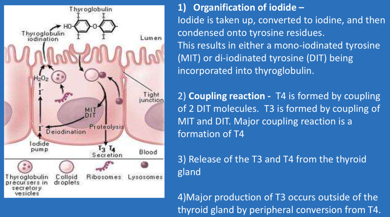 1) Organification of iodide: Iodide → Iodine → condensed onto tyrosine residues → mono or di-iodinated tyrosine