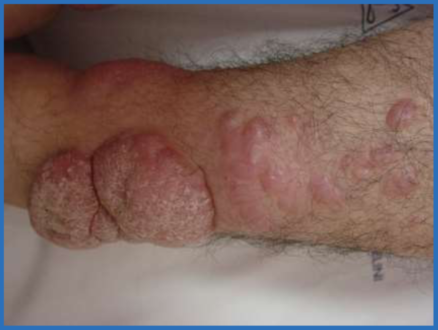 Asymmetric, raised, firm, pink-to-purple, brown plaques of nonpitting edema