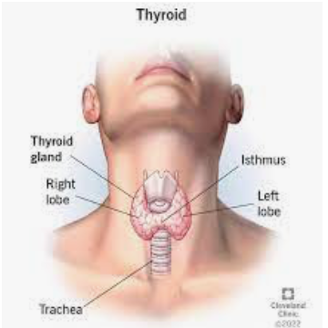 The thyroid is a butterfly-shaped gland located at the base of the neck, just below the Adam’s apple